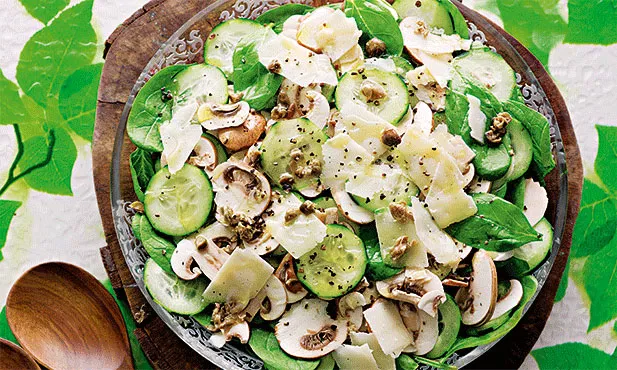 Uma entrada simples para variar da tradicional salada com que, por vezes, se abre uma refeição. Cogumelos sobre espinafres e pepino, por ser fresca, é uma boa ideia de entrada para um dia quente. Só precisa de 5 minutos para prepará-la.