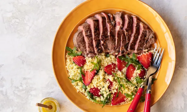 Uma receita simples e deliciosa preparada com a deliciosa carne Angus . Acompanhe o entrecôte com salada de cuscuz e morangos.