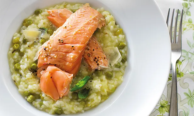 Não sabe como preparar, Salmão selvagem com risotto de ervilhas?