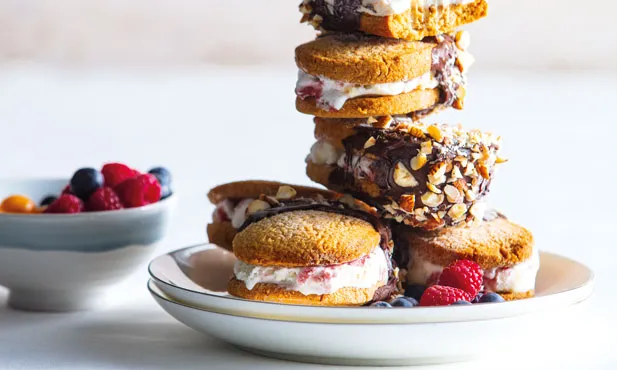 Sobremesa 40 min. 6 Vegetariana Sanduíche de gelado Não sabe como preparar, Sanduíche de gelado? As combinações perfeitas fazem-se de sabores deliciosos e plenos, e a sanduíche de gelado é uma dessas combinações. De comer e chorar por mais! Ingredientes 150 g farinha 60 g açúcar 60 g açúcar mascavado 1 c. chá rasa fermento em pó ½ c. café sal fino 50 g manteiga sem sal 70 g manteiga de amendoim 1 ovo S 200 g gelado Momentos Deliciosos de iogurte e frutos silvestres 80 g miolo de avelã Instruções 1. Coloque a farinha no robot de cozinha, junte os açúcares, o fermento, o sal, as manteigas e o ovo batido e triture até obter uma bola (ou bata com a batedeira). 2. Retire, molde em bola com cerca de 6cm de diâmetro, embrulhe em película aderente e leve ao congelador cerca de 30 minutos. 3. Pré-aqueça o forno a 180° C. 4. Corte a massa em 12 rodelas com cerca de 0,5 cm de espessura, coloque-as num tabuleiro de forno forrado com papel vegetal e leve ao forno cerca de 15 minutos. 5. Retire e deixe arrefecer por completo. 6. Coloque uma bola de gelado no centro de seis bolachas, tape-as com as restantes seis, pressionando levemente, e leve ao congelador cerca de 1 hora. 7. Derreta o chocolate em banho-maria, ou no microondas, e pique grosseiramente o miolo de avelã. 8. Passe rapidamente as sanduíches (só uma parte) pelo chocolate derretido e polvilhe-as com o miolo de avelã. 9. Leve novamente ao congelador até à hora de servir. Biscoitos E Bolachas Gelados Compartilhar artigo: 456