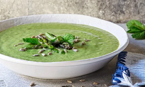 Prepare em apenas 30 minutos esta sopa de courgette. Adicione a hortelã para um toque fresco e decore com as pontas dos espargos.